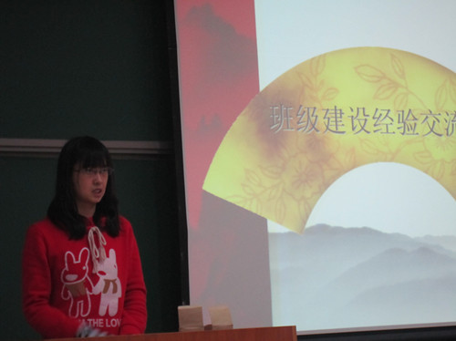 最后,101212班和101213班的学生代表详细介绍了优秀班集体答辩的经验和教训。优班答辩是新生入学面临的一个非常重要的课题和活动,每个班从组织到实践再到最后的总结和答辩材料准备都投入了大量的时间和精力,本次活动首先由101212班班长葛勍和宣委迟宏申上台发言,他们先将曾经答辩时用的材料向新生们展示,将活动的大概流程作了简要介绍,然后葛勍同学提出了几点建议和意见,这些内容包括准备工作要提前,充分;创意一定要新颖独特吸引眼球,要注重集体的力量,要鼓励每一个小班同学加入到本次活动中来,要开拓视野,扩大影响力。随后是101213班的班长王蕾和团支书蒋明彤同学上台展示,也向大家提出了很多的建议。