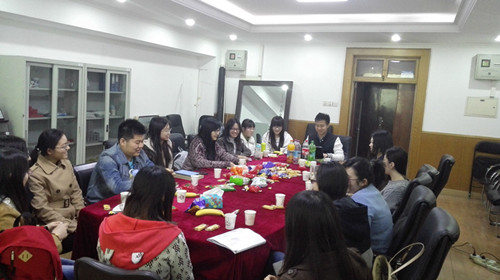 晚上七点,如心楼409坐满了参会的党员和入党积极分子们,大家围坐桌前,相互交流,气氛一下变得十分温馨和谐。